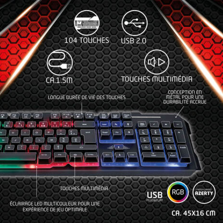 Enhance your gaming performance with this AZERTY gaming keyboard , featuring dynamic backlighting for an immersive gaming experience. With dimensions of 45.8 x 16 x 3.5 cm and weighing 720 grams , this keyboard is designed for both comfort and durability during long gaming sessions....