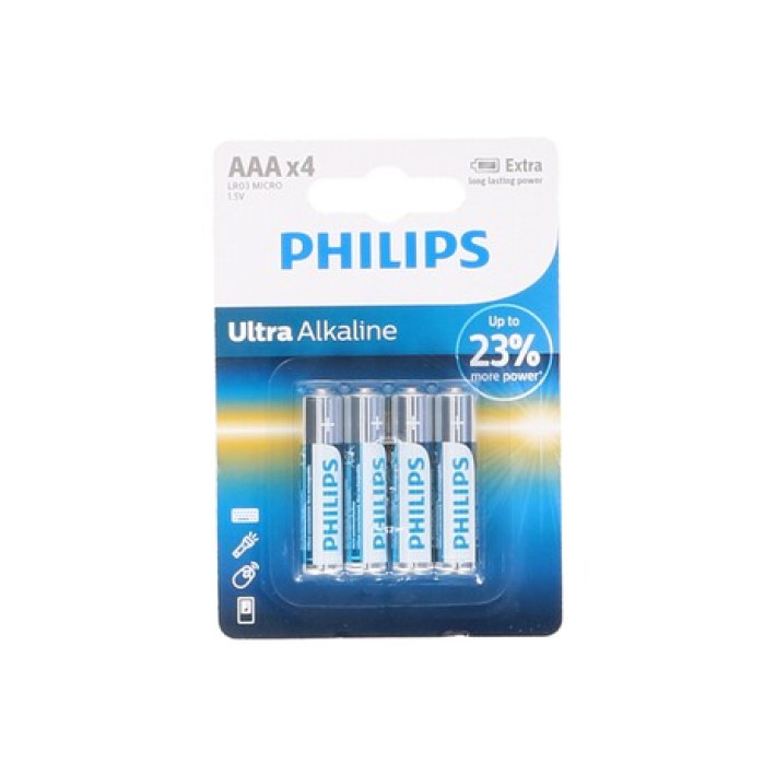 The LR03/AAA Ultra Alkaline Batteries come in a 4-pack, offering high-quality, long-lasting power for a variety of electronic devices. These ultra alkaline batteries are designed to provide consistent and reliable energy, making them suitable for devices like remote controls, clocks, and portable gadgets.